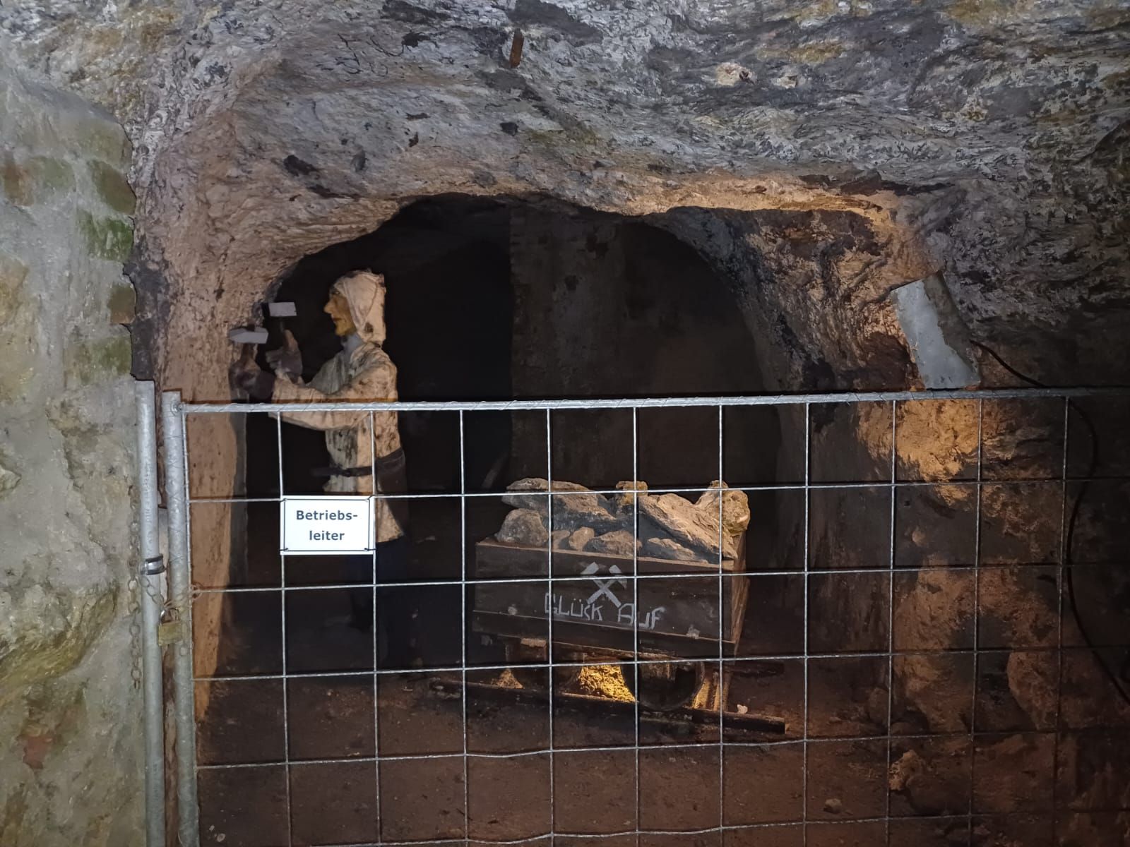 Auf dem Weg weiter hinein in den Berg konnte man etliche Abzweigungen von Querstollen sehen. In einer Felsengrotte sah man nachgestellt einen Arbeiter mit seinem damaligen Arbeitswerkzeug und konnte sich ein Bild von den schweren und unbarmherzigen Arbeitsbedingungen unter Tag machen. Auch den Pferdestall konnten man sehen in welchem die Arbeitstiere, die für den Gipstransport eingestellt waren und an einem Göpel die Aufzugsmaschine für die mit Gips gefüllte Hunte betrieben, ihr Leben unter Tage verbringen mussten und dabei erblindeten. Die Temperatur im damaligen Aufenthaltsraum der Bergleute beträgt auch heute noch „angenehme“ 12 Grad. Das Wasser des 300 m² kleinen „Blaue See“ leuchtete und gab uns einen Vorgeschmack auf das Highlight der Führung – der Bootsfahrt auf dem großen See. Es ging weiter zur Barbara-Kapelle - sie ist die Schutzpatronin der Berglaute, ihr wurde sogar ein ganzer Stollen gewidmet.