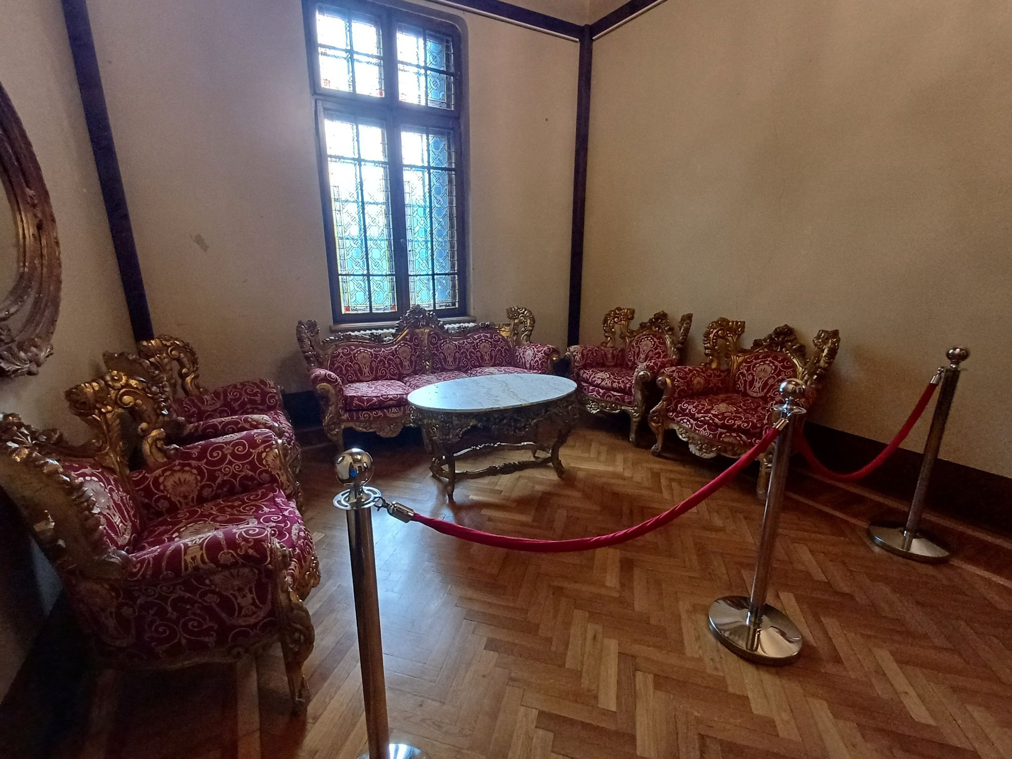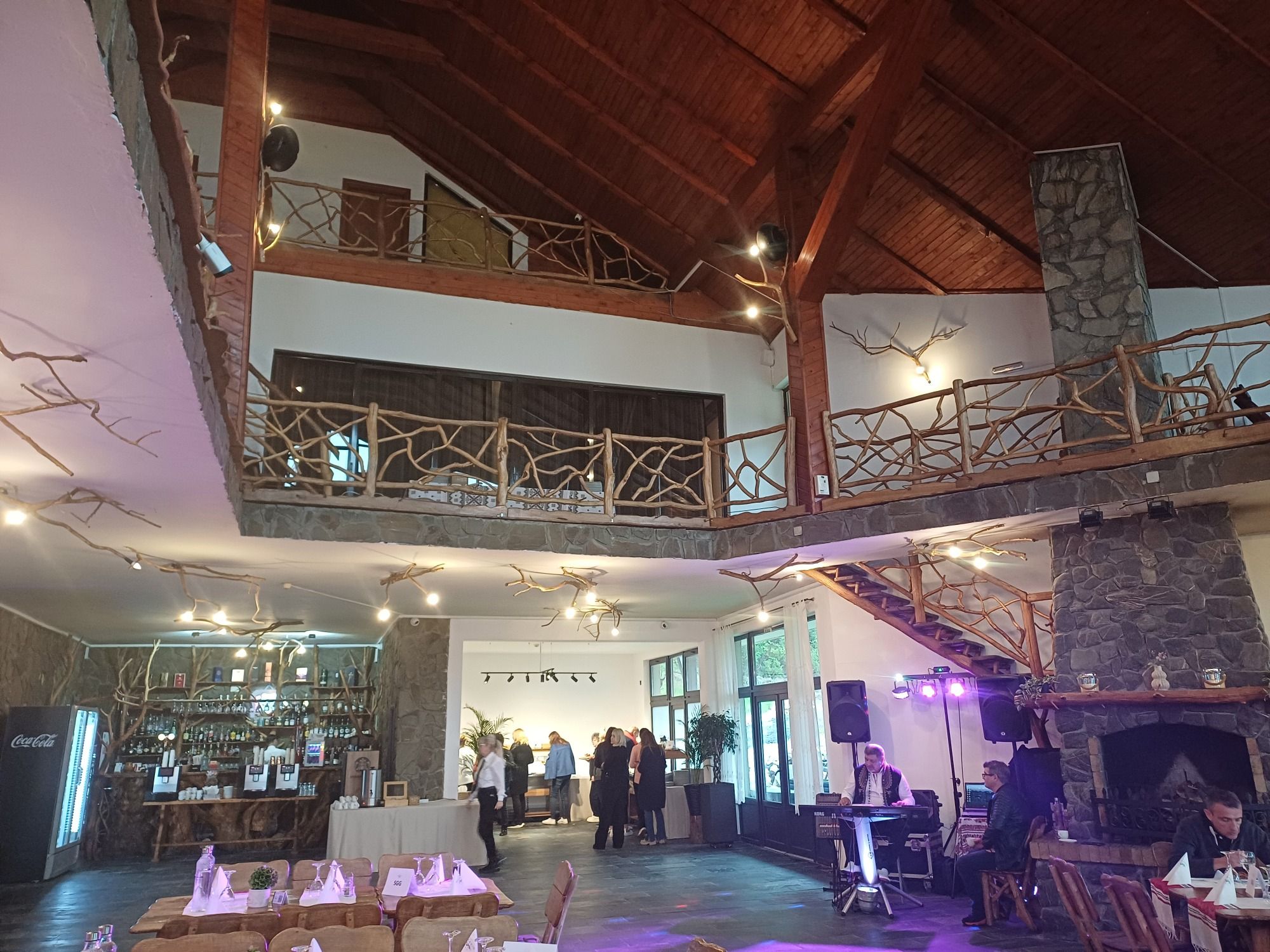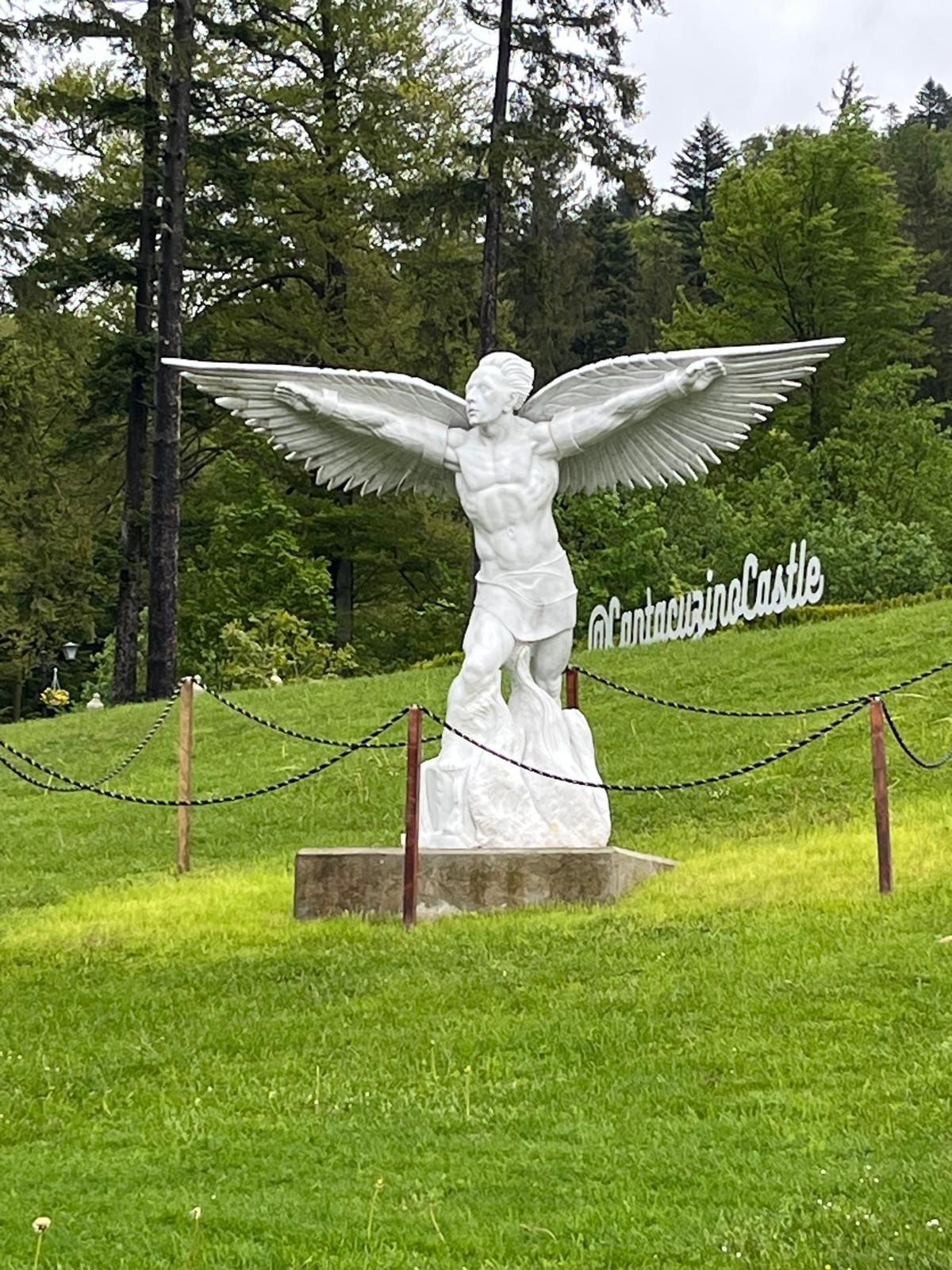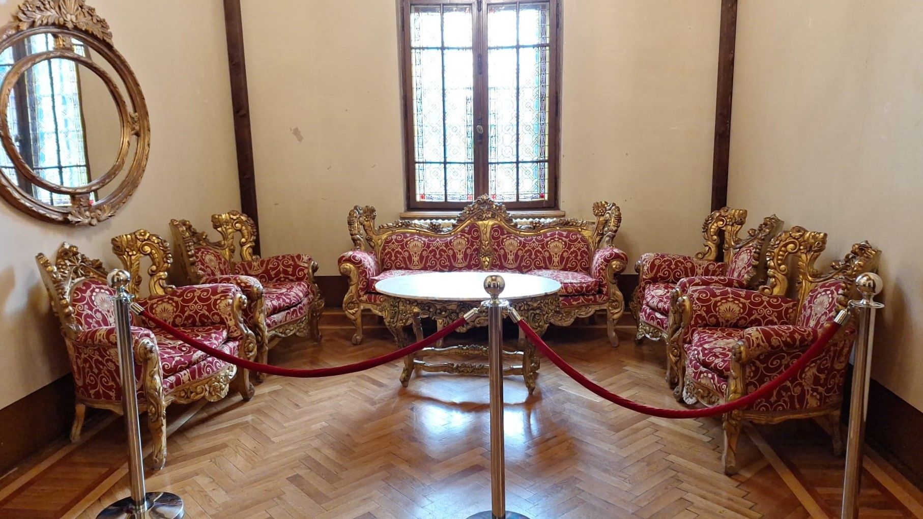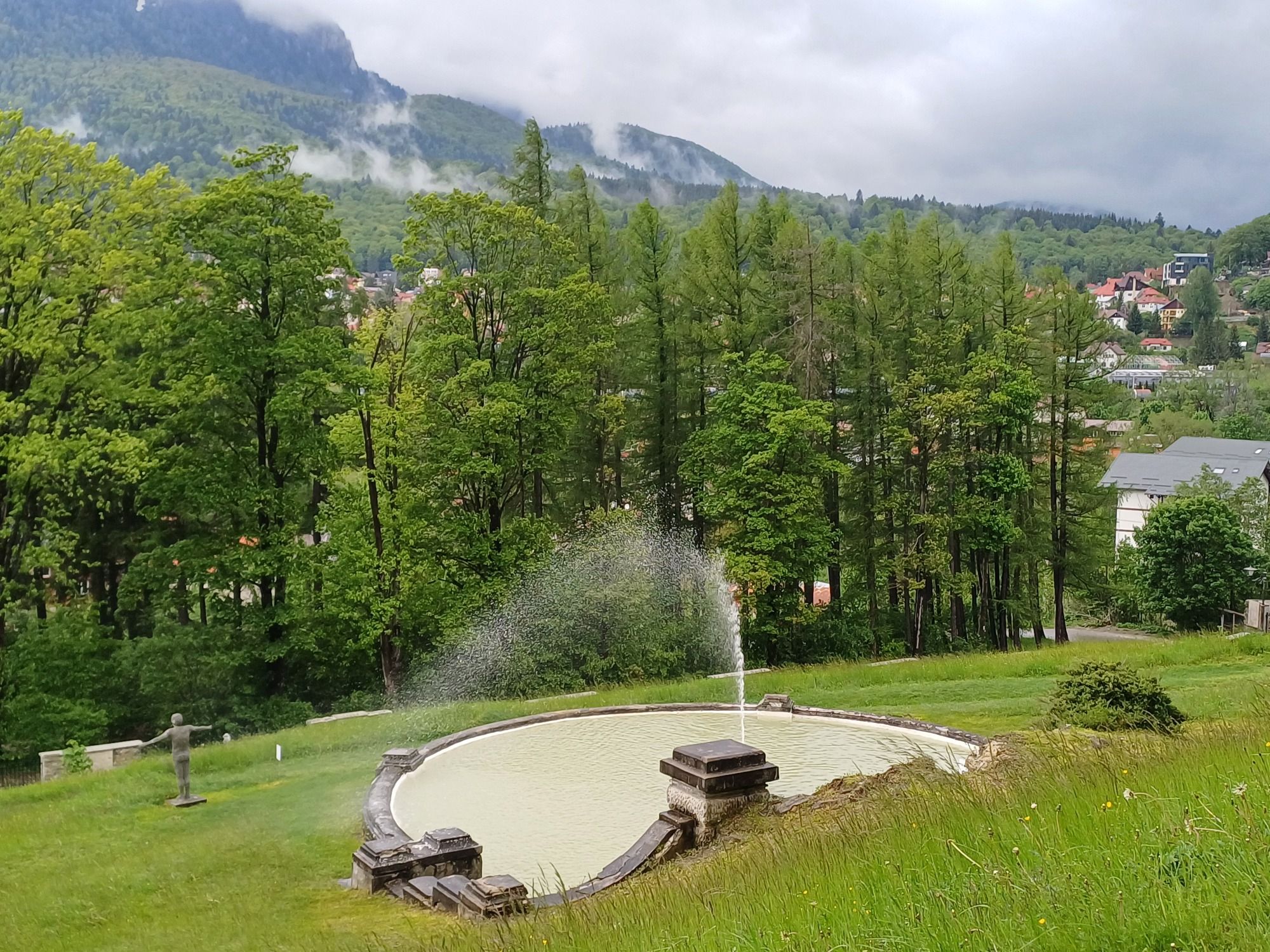 Es regnete unaufhörlich in Predeal. So entschied man sich, den Ausflug nach Sinaia nicht durchzuführen. Nach dem gemütlichen Frühstück begab man sich auf eine halbstündige Fahrt, um in Busteni das Schloss Cantacuzino zu besichtigen. Auf 1000 Metern Höhe erhebt sich majestätisch das 1911 von Gheorghe Grigore Cantacuzino erbaute Schloss, direkt vor dem 2.500 Meter hohen Bucegi Gebirge. Ein regenloser, kurzer Weg bergauf vom Parkplatz zum Schloss und schon konnte sich die Reisegruppe den ersten großen Eindruck des eindrucksvollen Anwesens machen. Das über 3400 m² große Gebäude aus hellem Sandstein, den Glasmalereien, dem Marmorstuck, den beeindruckenden, bemalten Decken, den hölzernen, steinernen oder eisernen Geländer, den Kaminen aus weißem Stein erbaut, den vielfarbigen Mosaiken vervollständigen die herrschaftliche Atmosphäre der Residenz, verleihen den Räumen ein romantisches Ambiente und sorgten für Bewunderung. Der große, hohe Ballsaal beherbergt Wandmalereien auf Cordoba-Leder, welche die berühmtesten Mitglieder aus einem der sechs Zweige der Familie Cantacuzino darstellen. Eine einzigartige Sammlung von Heraldik in Rumänien zeigt die Wappen der mit den Cantacuzino‘s verwandten Adelsfamilien. Von der Sonnenterrasse aus konnte man die wunderschönen Gärten mit Kunstwerken und Springbrunnen sehen und einen Blick auf die atemberaubende Umgebung und die herrliche Berglandschaft werfen.