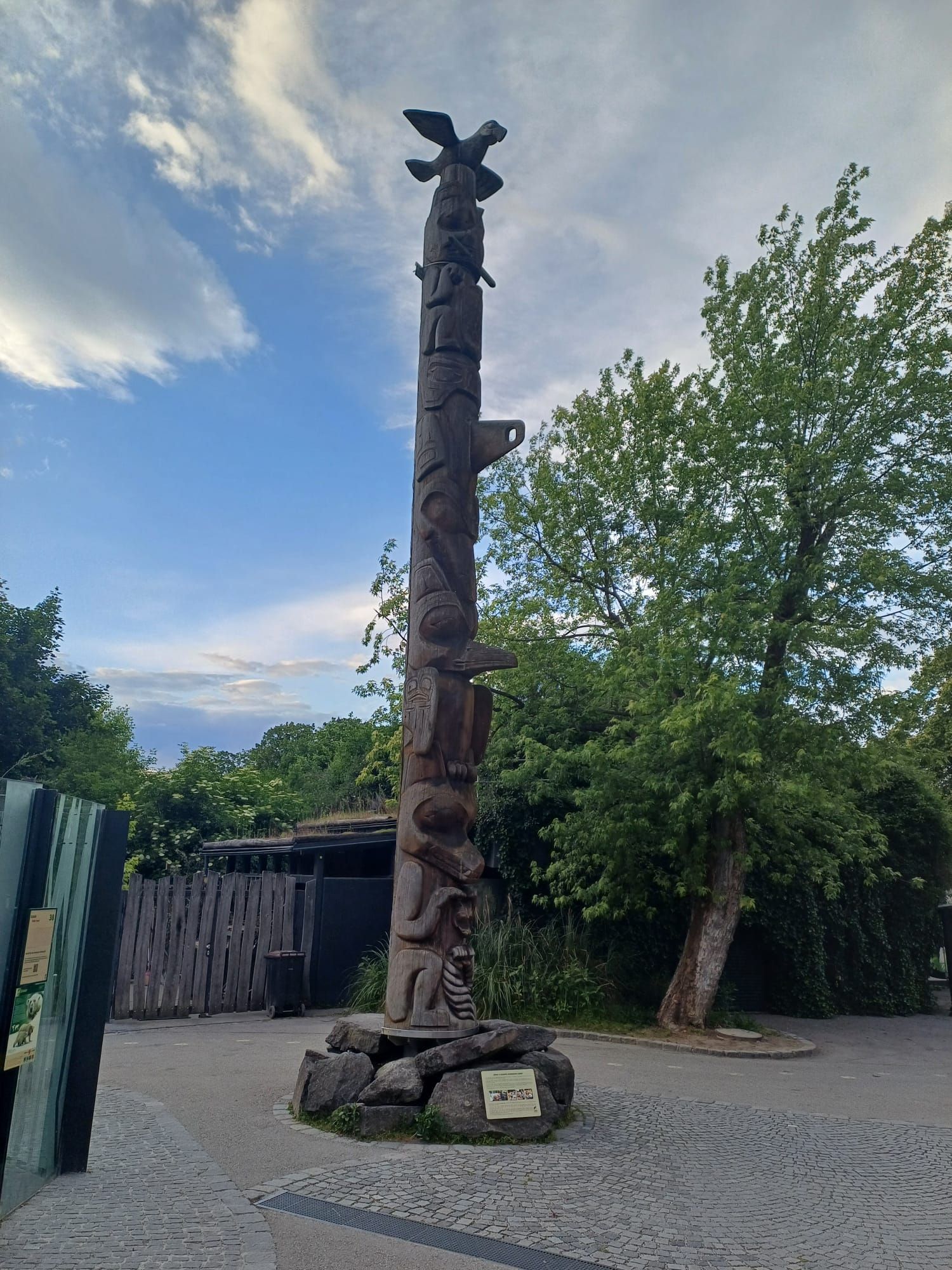 Vorbei am herrlich gearbeiteten Totempfahl von Alver Teit, einem Künstler vom Volk der Nisga`a aus Kanada, ging es weiter zu den Mähnenrobben, welche auch schon in Abendstimmung waren. Lustiger waren da die Königspinguine, die betrachteten neugierig die späten Besucher/innen. In Fresslaune waren die Burchell-Zebras, die Elenantilopen und Blessböcke. Ein lautes Geschnatter hörte man schon von Weitem. Unzählige Rote Flamingos hatten im Wasser ihren Spaß, die Nordafrikanischen Rothalsstrauße inspizierten auch noch ihr Gehege vor der Nachtruhe.
